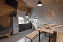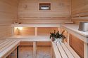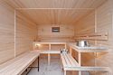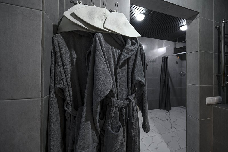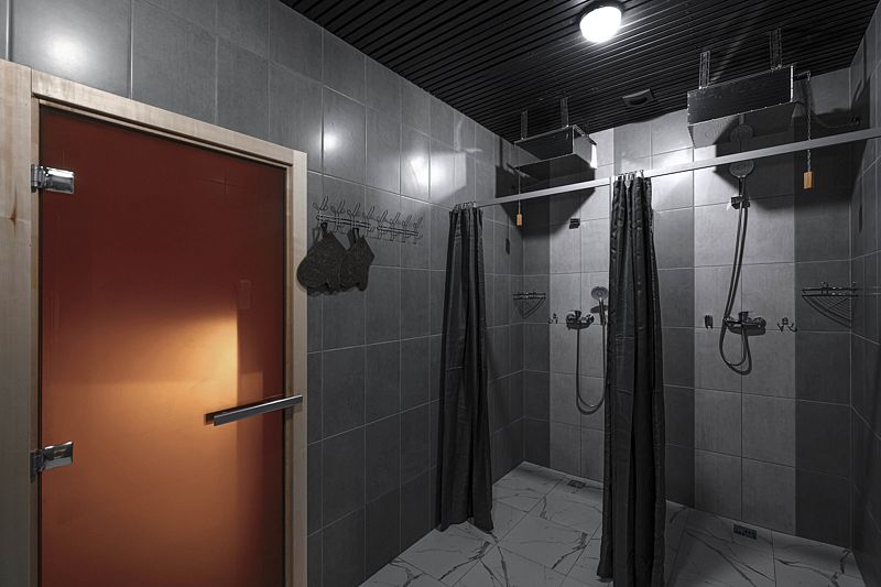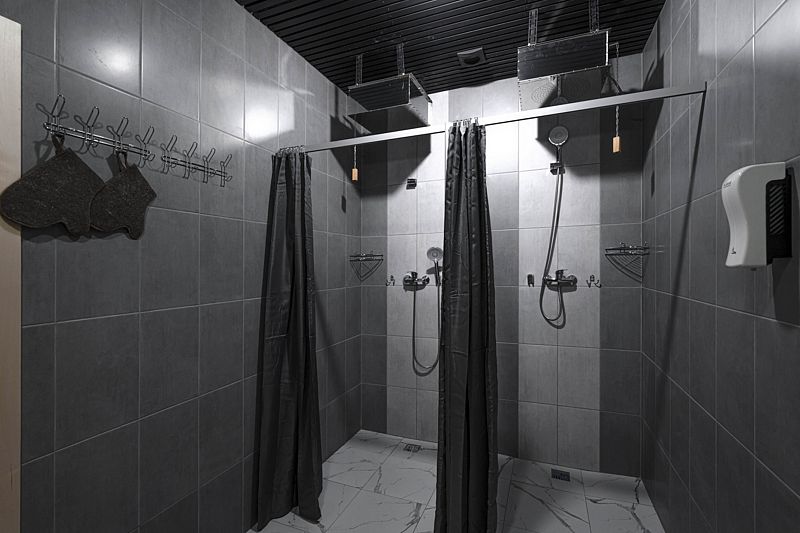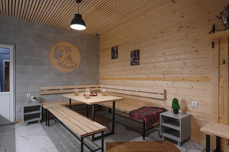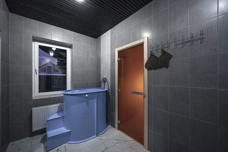 На первом этаже находится вместительная парная до 10 человек, с тропическим душем, санузлом, холодной купелью, просторной комнатой отдыха с кухонной зоной и телевизором, с выходом на большую террасу и к банному чану на улице.