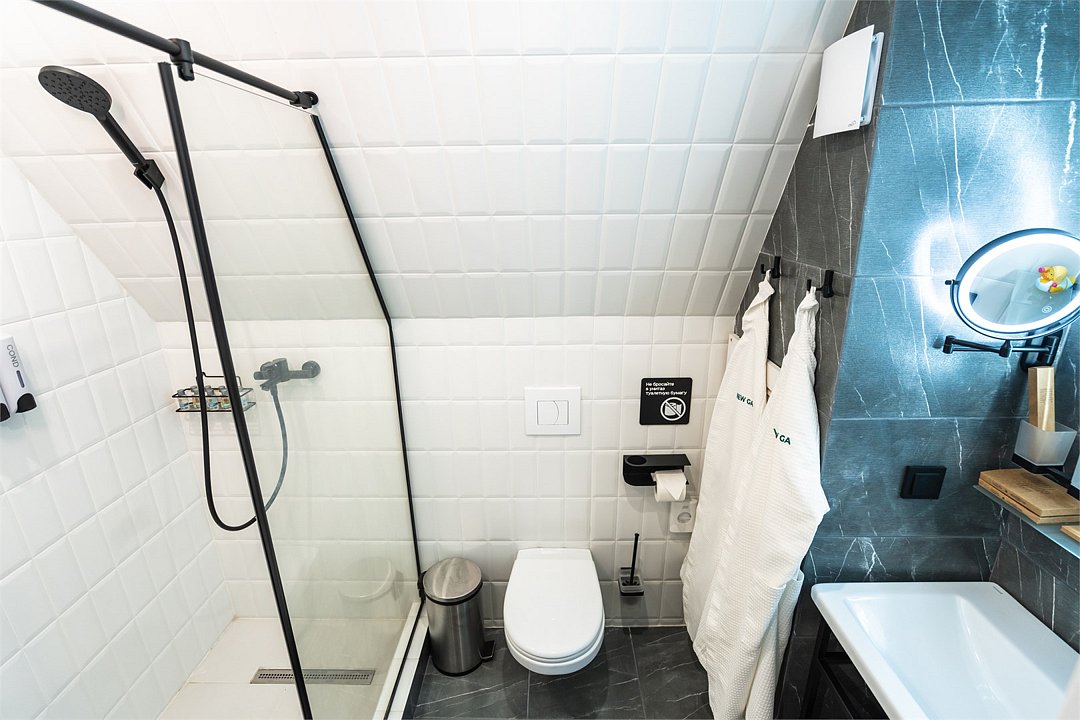 - ванная комната с душевой кабиной, фирменный банный текстиль, тапочки, фен, косметический набор;
