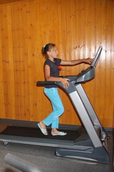 Тренажерный зал небольшой, но есть минимум, который поможет поддержать форму: беговая дорожка, велотренажер, силовой тренажер.