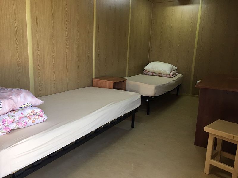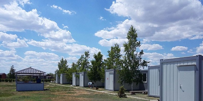 На базе установлены вагончики с кондиционером. В данной зоне есть места общего пользования: оборудованная кухня, столовая с холодильником, сан.узел с душевыми, мангальные беседки.