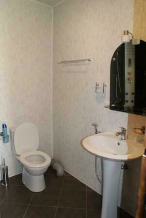 В коттедже расположены: холл, зал, кухня, ванная комната на каждом этаже, пять спален. Две из которых оборудованы двухспальными кроватями, две - полуторными и одна спальня с двумя полуторными кроватями.