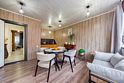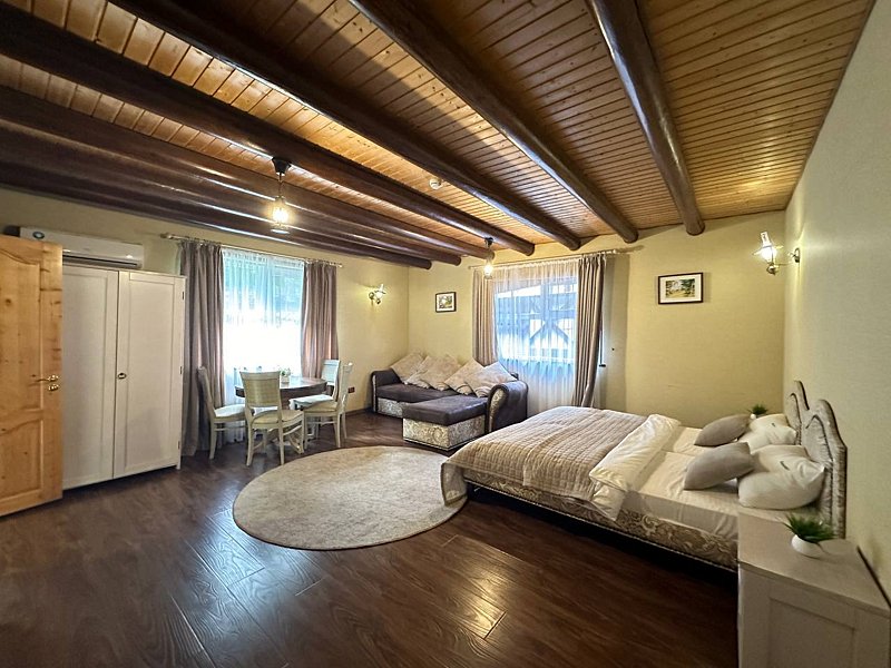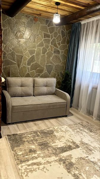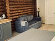Внутри полностью оборудованная кухня с плитой, чайником, микроволновкой, холодильником. В наличии есть вся необходимая посуда - тарелки, стаканы, бокалы, сковородки, кастрюли, столовые приборы. В гостиной зоне комфортный диван с 1 дополнительным полноценным спальным местом, журнальный стол, кресла.