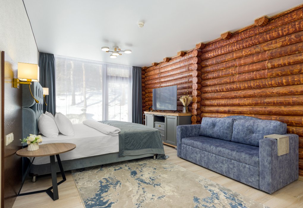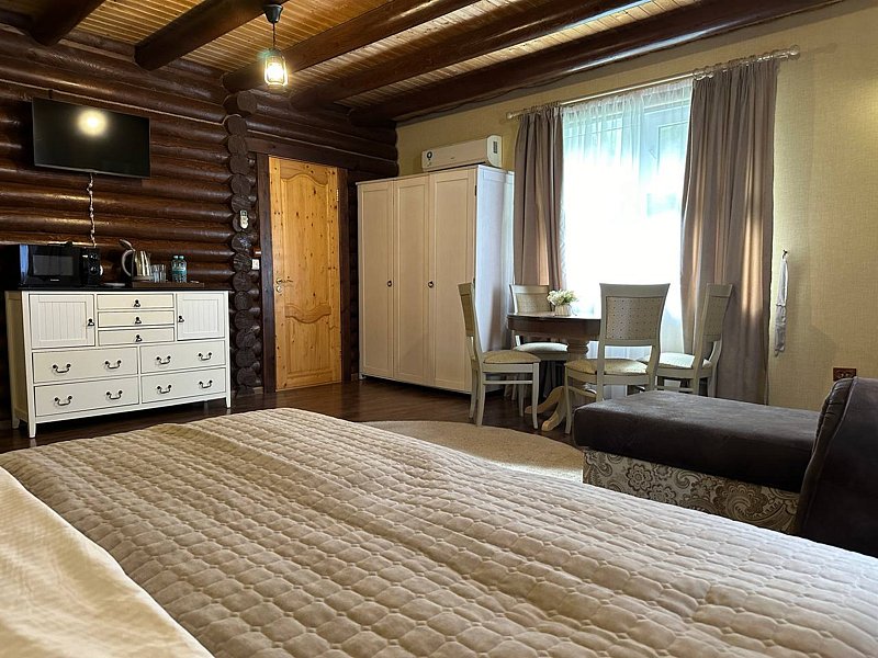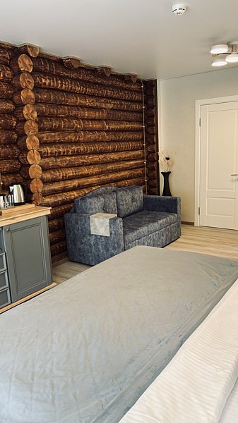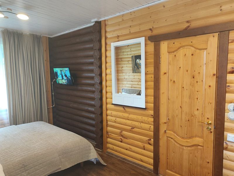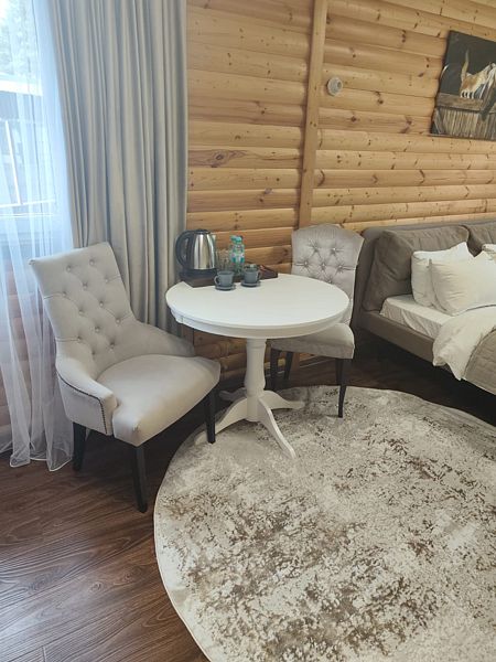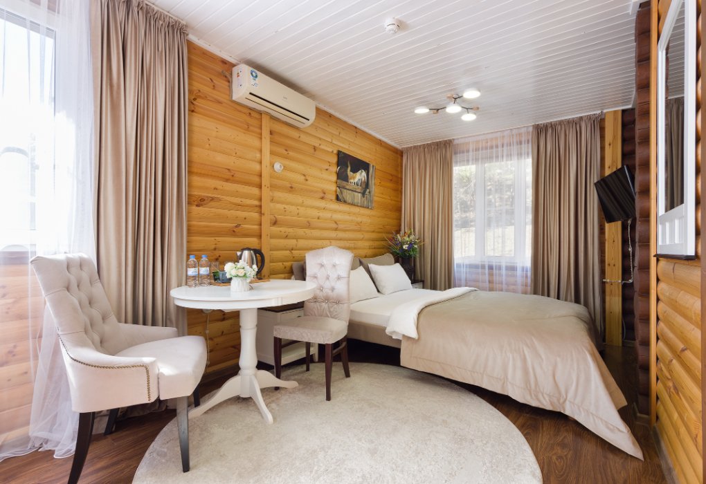 Двухместный номер с двухспальной кроватью и диваном, собственной верандой, мангальной зоной и выходом в лес. В номере есть все необходимое для комфортного проживания.