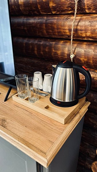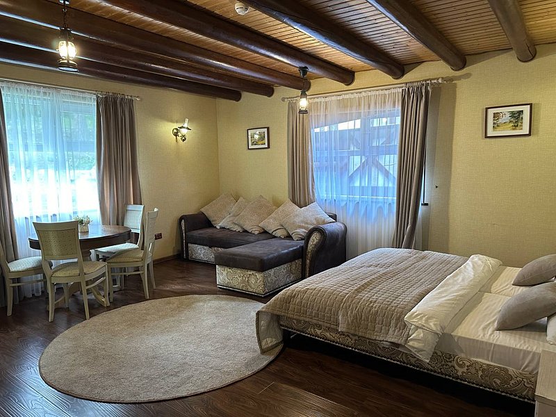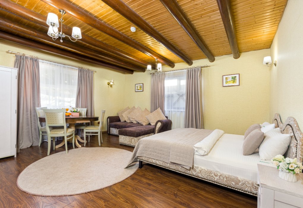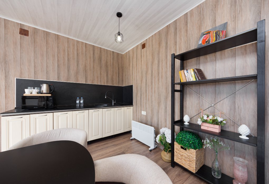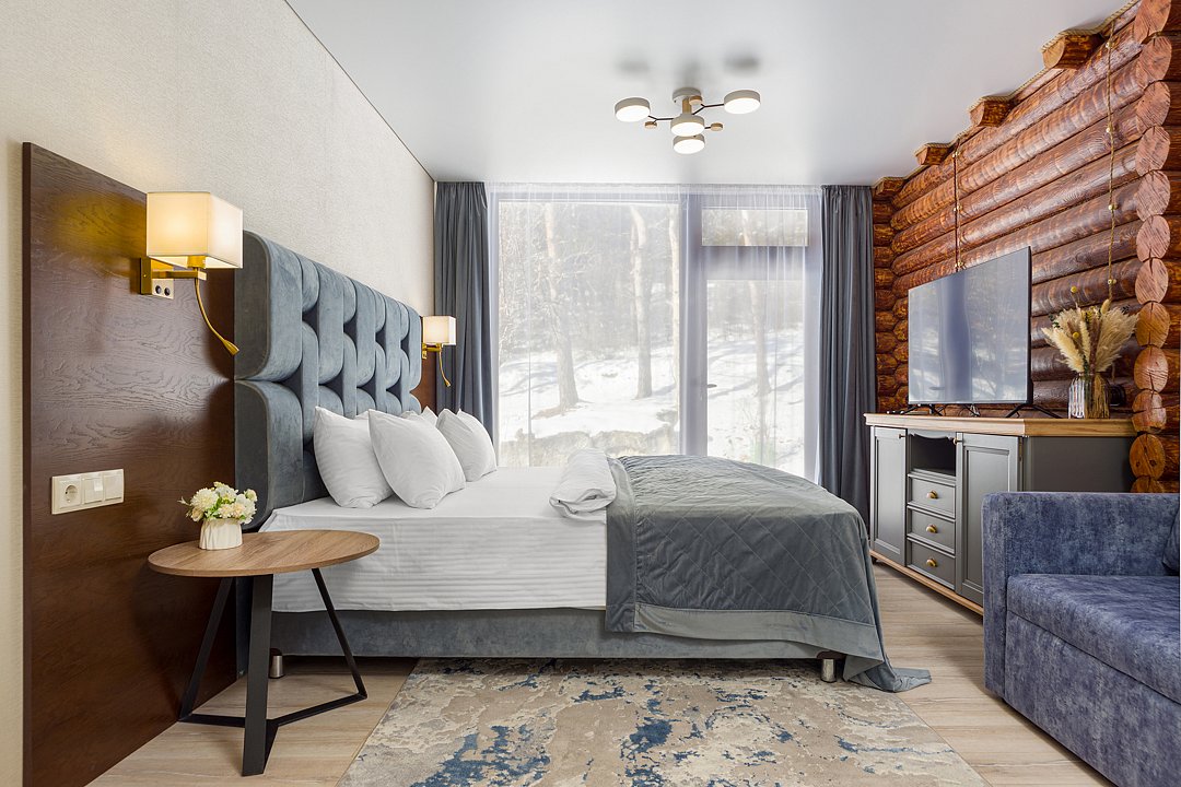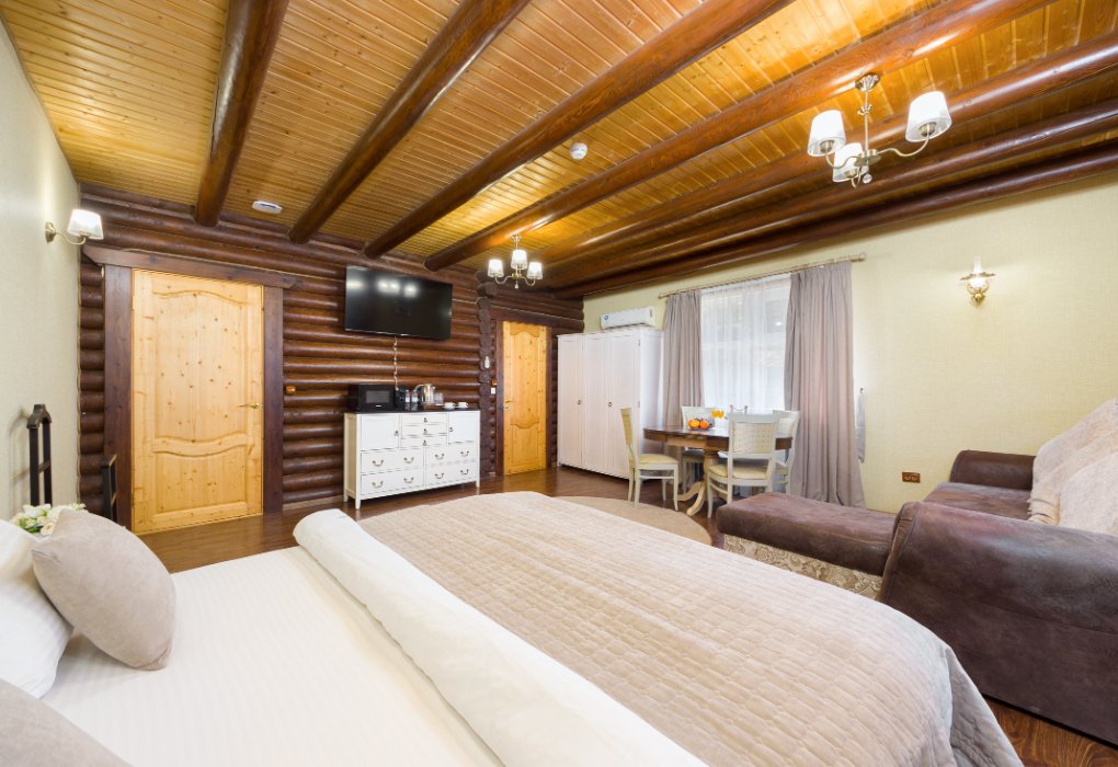 Двухместный номер с двухспальной кроватью и диваном, собственной верандой, мангальной зоной и выходом в лес. В номере есть все необходимое для комфортного проживания.