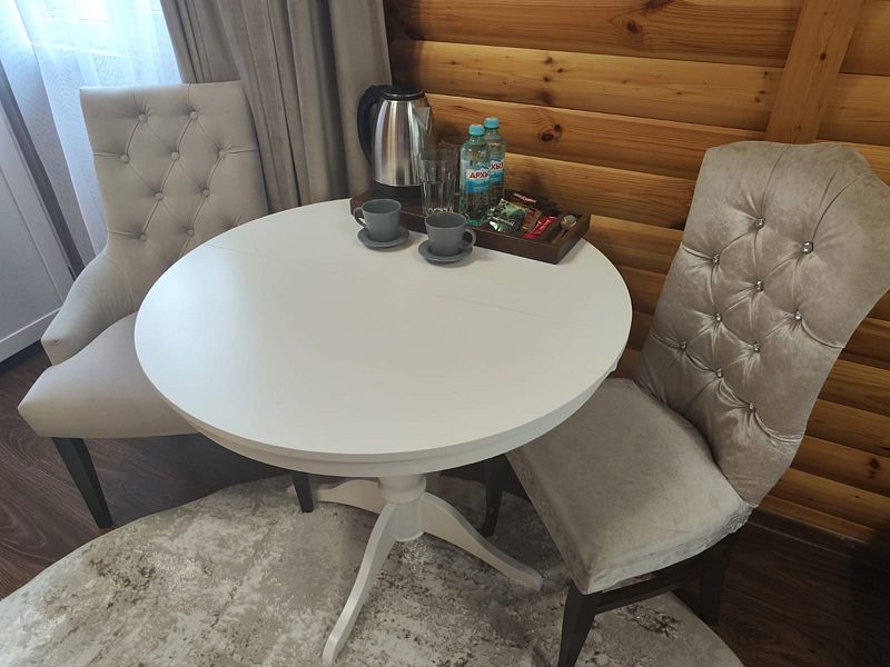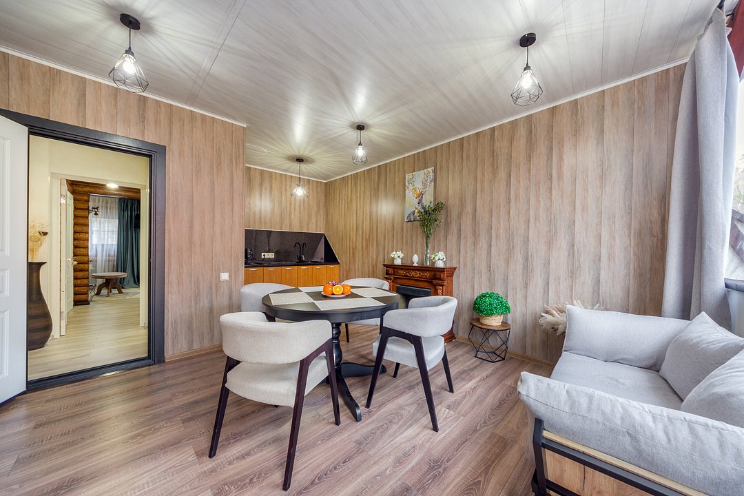 Коттедж представляет собой единое пространство спальни и террасы с кухней и столовой, принимает гостей по системе 2+1.Внутри полностью оборудованная кухня с плитой, чайником, микроволновкой, холодильником. В наличии есть вся необходимая посуда - тарелки, стаканы, бокалы, фужеры, сковородки, кастрюли, столовые приборы. В гостиной зоне комфортный диван с 1 дополнительным полноценным спальным местом, журнальный стол, кресла. В спальной зоне - двуспальная кровать, прикроватная мебель, светильники. У коттеджа своя патио-зона с кушеткам, столом, мангалом. Гостям предоставляются постельное белье, полотенца, туалетные и косметические принадлежности, халаты, тапочки, комплиментарный карельский чай при заезде. Ориентирован на семейный отдых и романтическое удлинение. Детская кроватка и стульчик для кормления бесплатно по предварительному запросу.