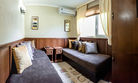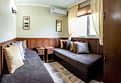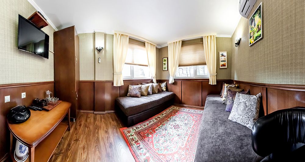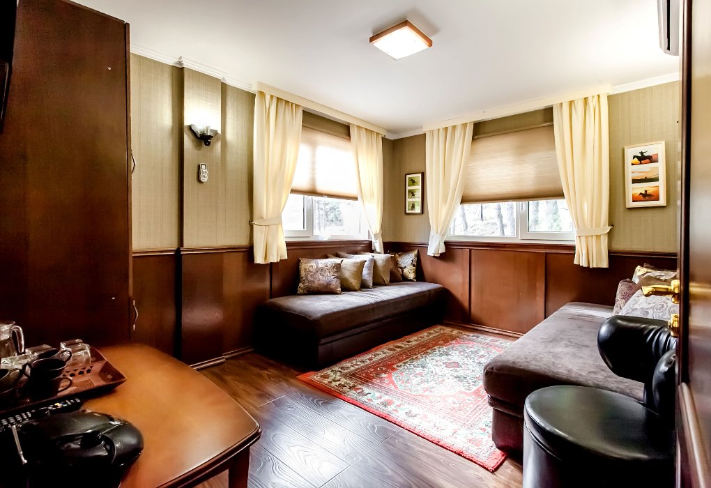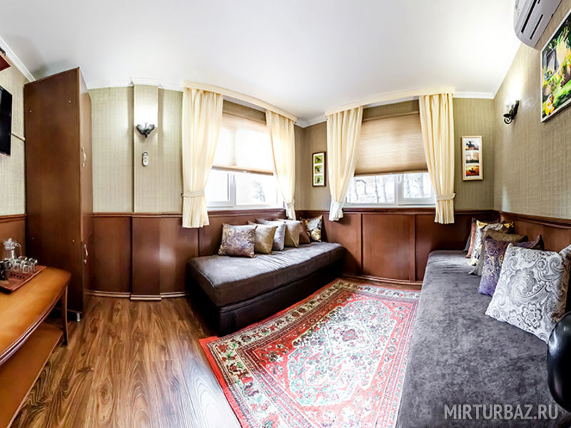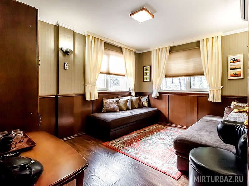 Внутри полностью оборудованная кухня с плитой, чайником, микроволновкой, холодильником. В наличии есть вся необходимая посуда - тарелки, стаканы, бокалы, фужеры, сковородки, кастрюли, столовые приборы. В гостиной зоне комфортный диван с 1 дополнительным полноценным спальным местом, журнальный стол, кресла.