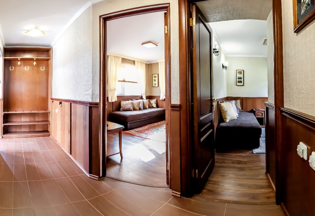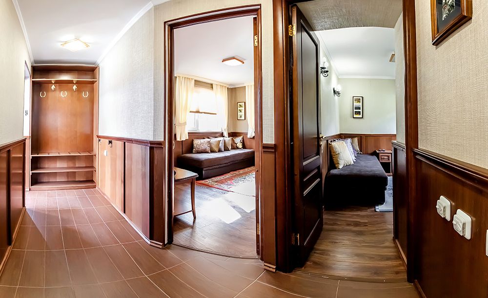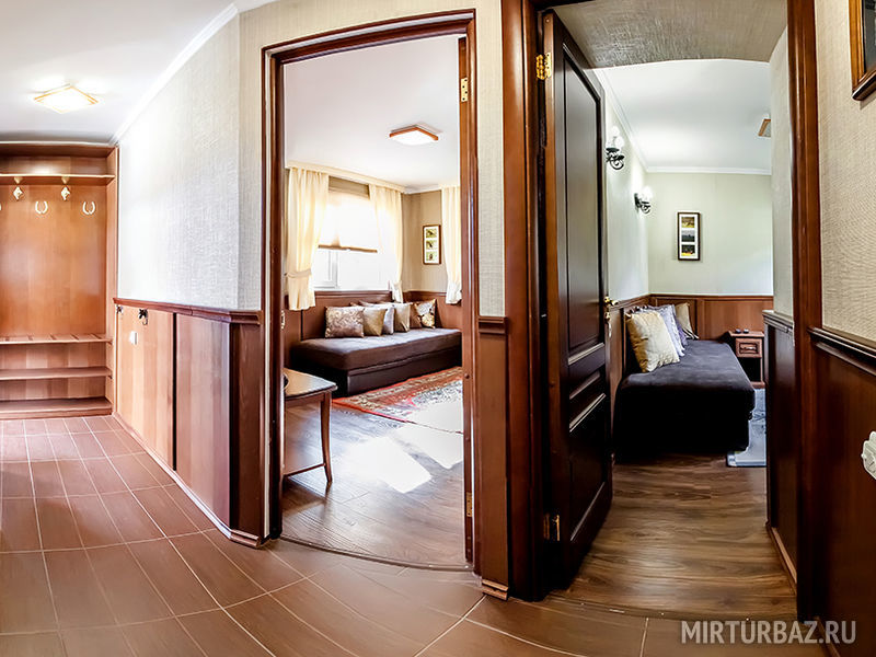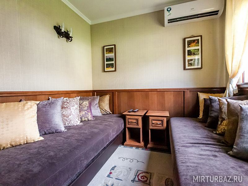 Двухкомнатный четырехместный номер, собственной верандой, мангальной зоной и выходом в лес. В номере есть все необходимое для комфортного проживания.