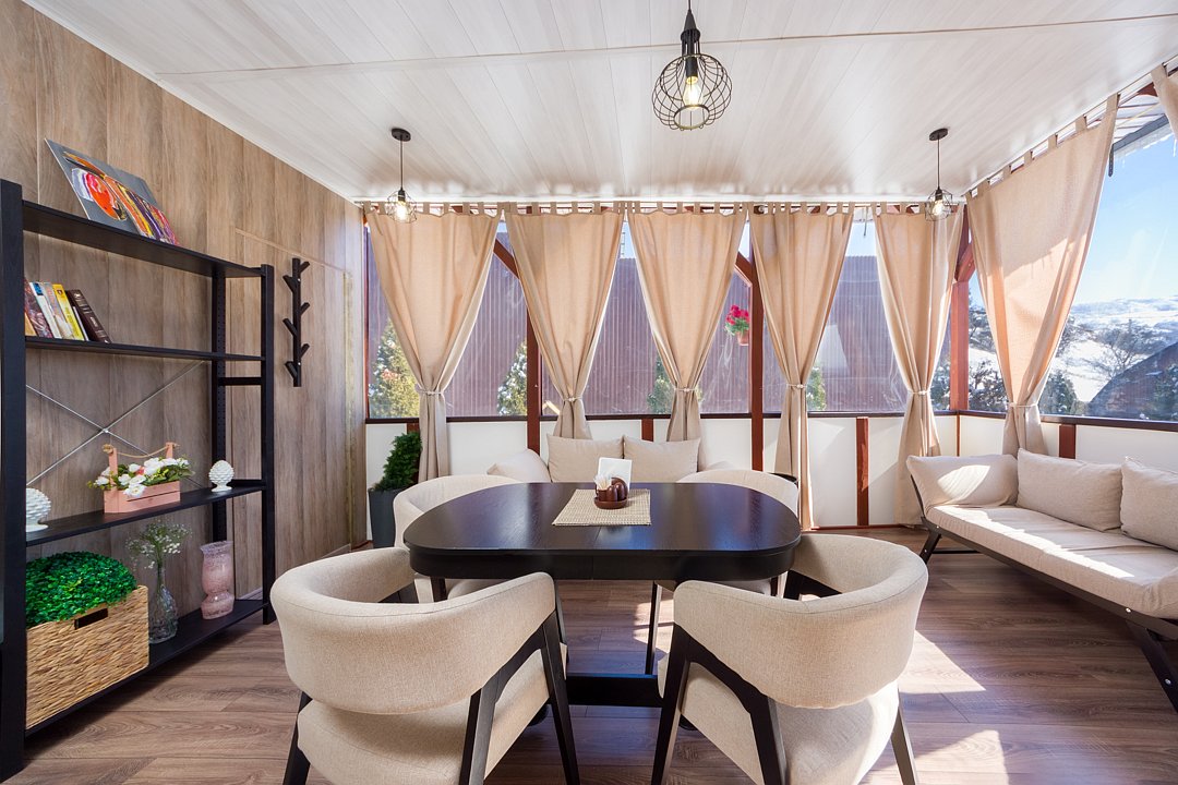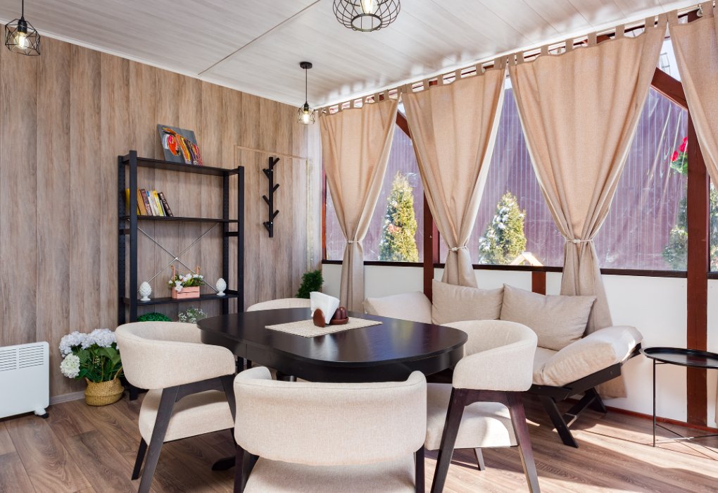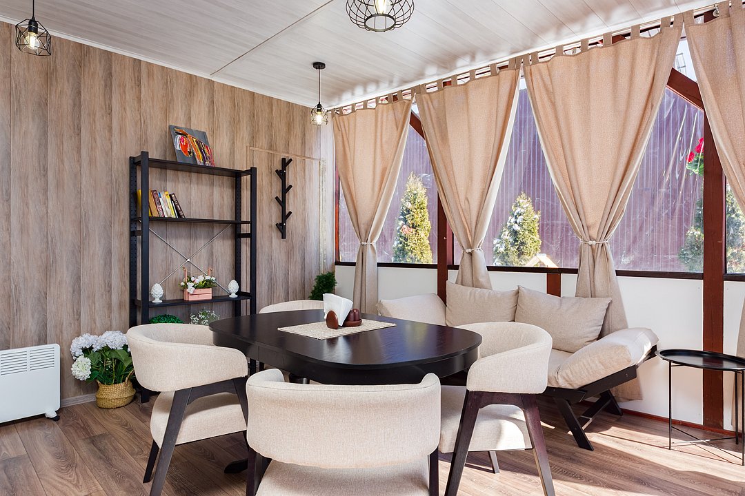 Коттедж представляет собой единое пространство спальни и террасы с кухней и столовой, принимает гостей по системе 2+1.