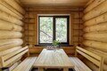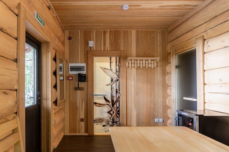 Русская баня с панорамным окном в лесу