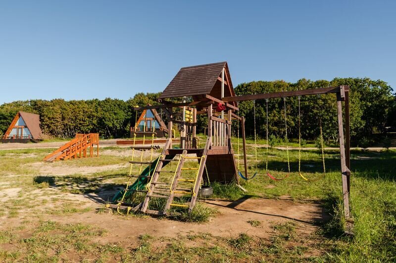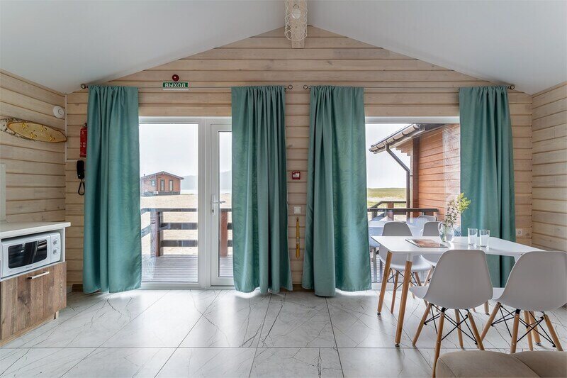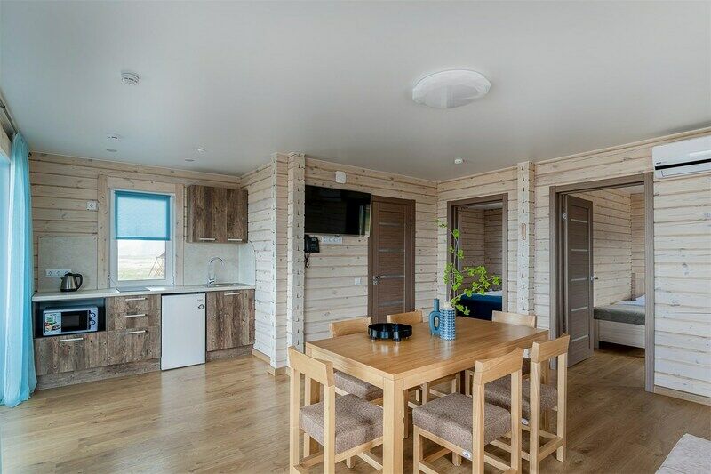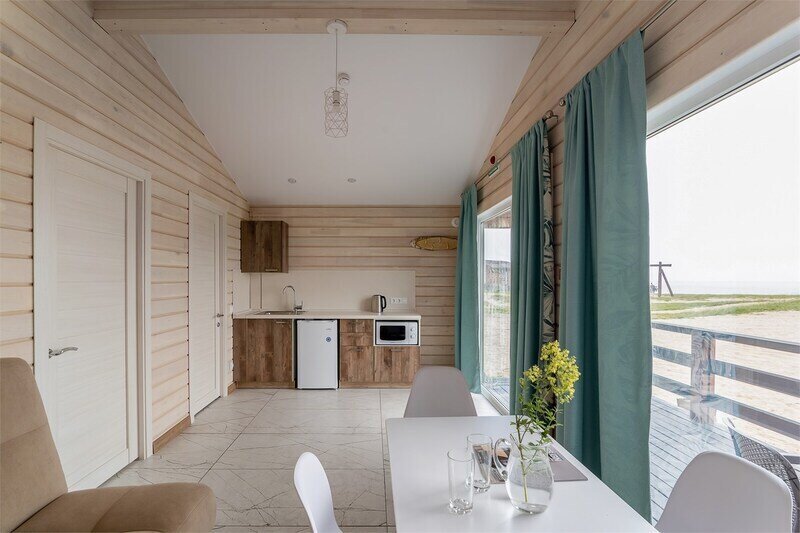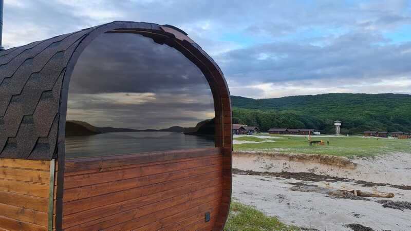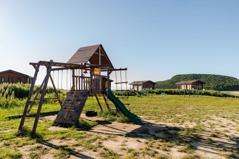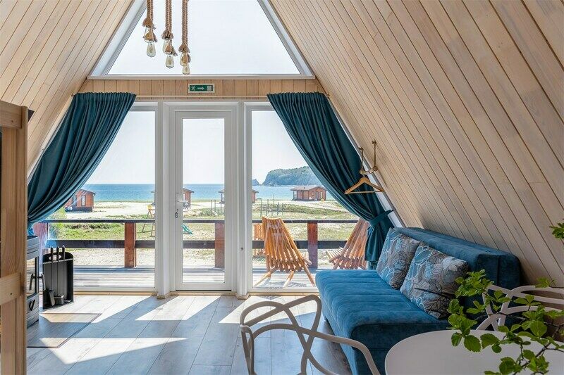 Семейный отдыхДостоинстваПровели здесь два замечательных дня, которые точно запомнятся нам надолго. Погода нам благоволила. Очень приятно было смотреть на море, нежась на солнышке. Сотрудники очень быстро выдали нам ключи от двухместного домика. Внутри даже камин есть. Очень уютно. Отдельно находится кухня, есть все возможности для готовки, правда продуктов нет. Кто не хочет готовить - для тех бюджетное кафе с большим выбором блюд. Но больше всего восторгов вызвала баня