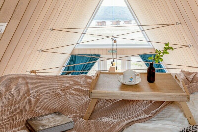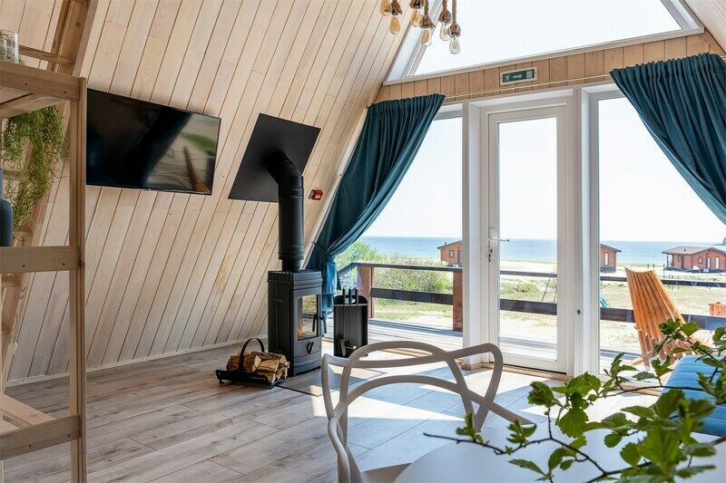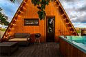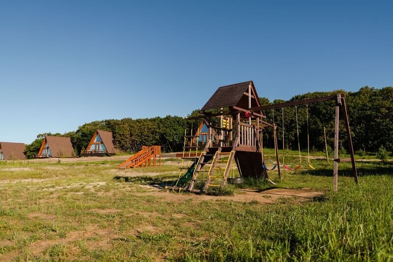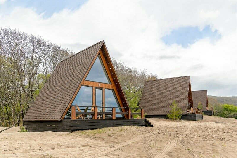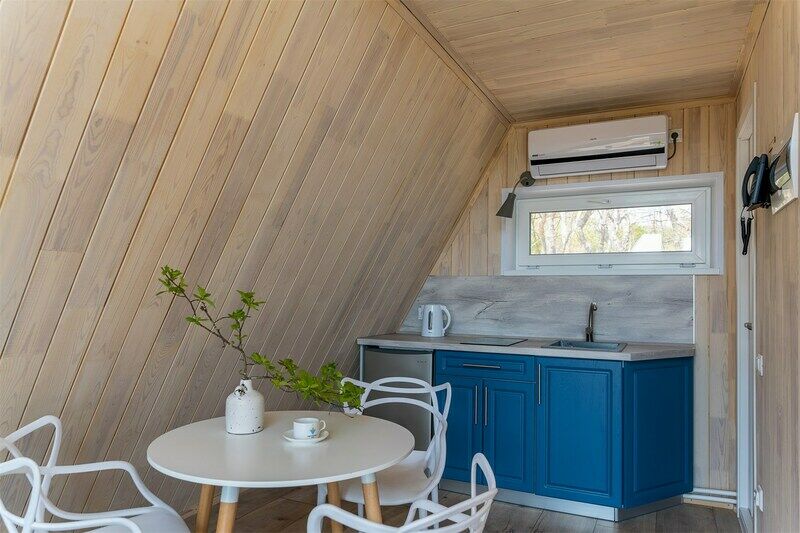 Идеальный вариант для романтического отдыха с видом на море — A-frame дом с камином. В доме есть все необходимое для комфортного отдыха: оборудованная кухонная зона (холодильник, варочная панель, СВЧ-печь, чайник, комплект посуды), санузел с душевой кабиной, телевизор, кондиционер, wi-fi, индивидуальная мангальная зона.