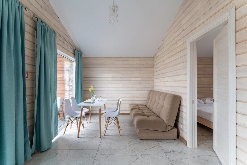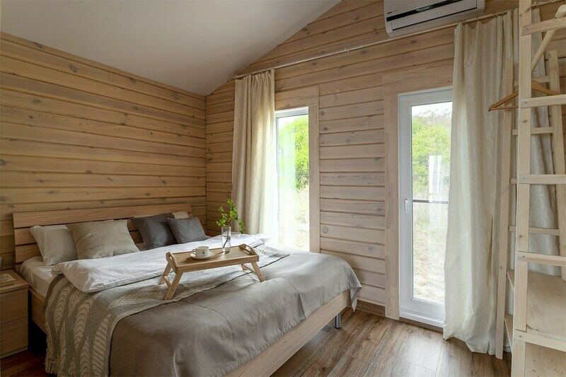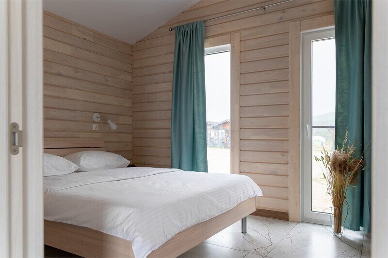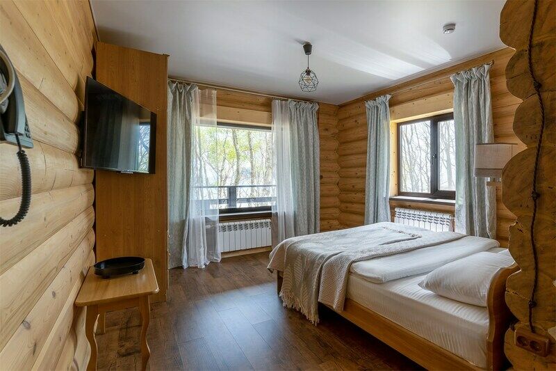 Номер с террасой для тех, кто любит уединение. Расположен в лесной части комплекса. Дом выполнен из дикого бруса ручной обработки, что создает неповторимый микроклимат и сохраняет аромат дерева. Расстояние до моря — 180 м.