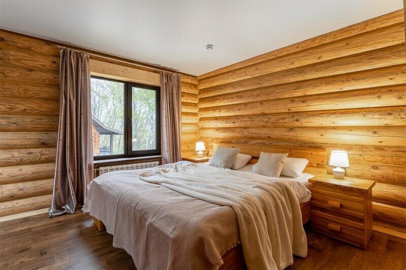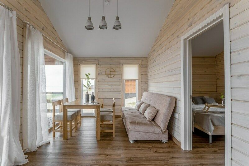 Уютный дом для большой семьи или компании. В доме две спальни и просторная гостиная с террасой, в одной спальне двухместная кровать, во второй — две одноместные. В коттедже есть все необходимое для комфортного отдыха.