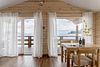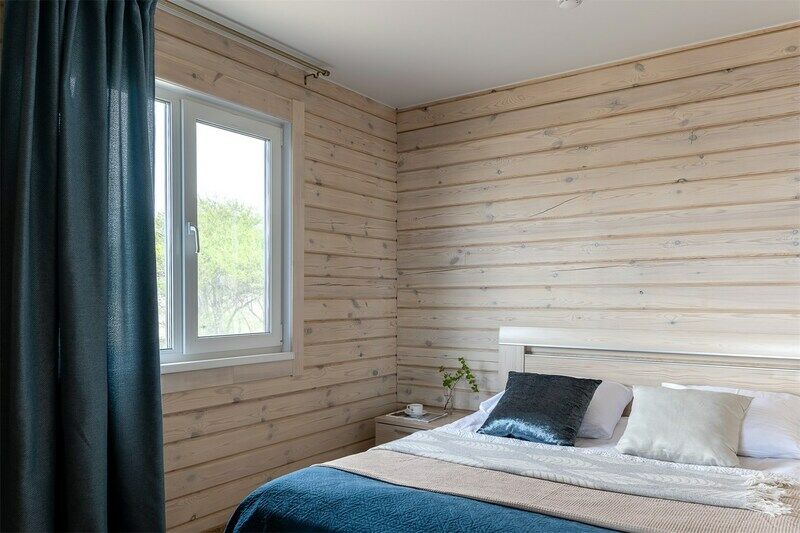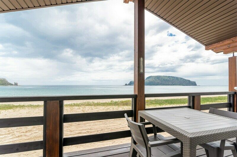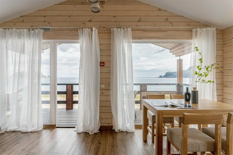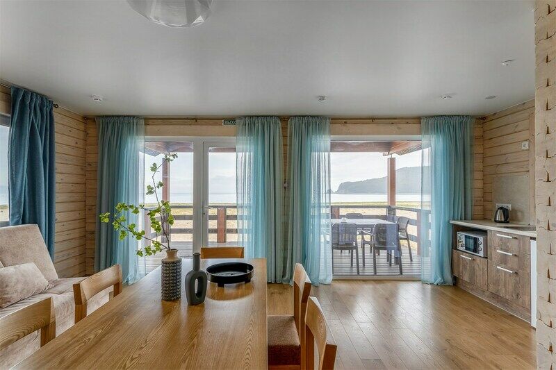 Уютный дом с террасой на берегу моря. Панорамные окна открывают потрясающий вид на бухту. Дома из натурального дерева хвойной породы, интерьер выполнен в светлых тонах, что создает простор и легкость.