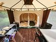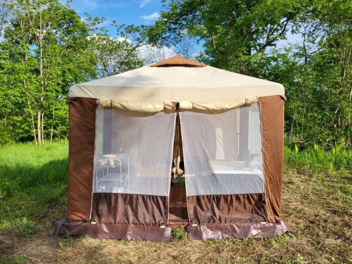 Шатер «Комфорт» удобен для проживания семьи до четырех человек. Шатер установлен на деревянном настиле, и внутри есть два модуля — спальный и кухонный.