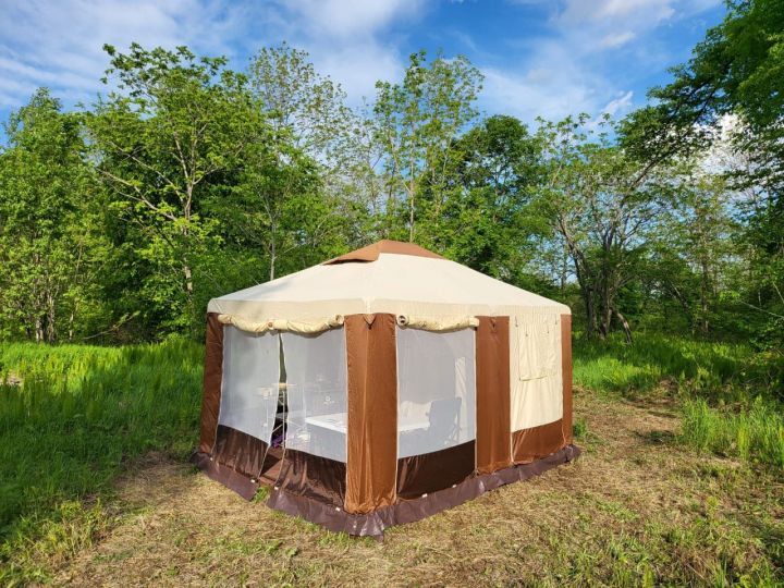 Шатер размещен в лесу, защищает от жаркого солнца. В лесу комаров нет!