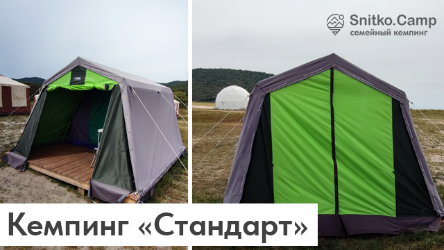 Кемпинговая палатка «Стандарт» комфортна для проживания двух человек. Палатка установлена на горизонтальной поверхности, растянута до вашего приезда — вам нет необходимости тратить время отдыха на установку палатки.