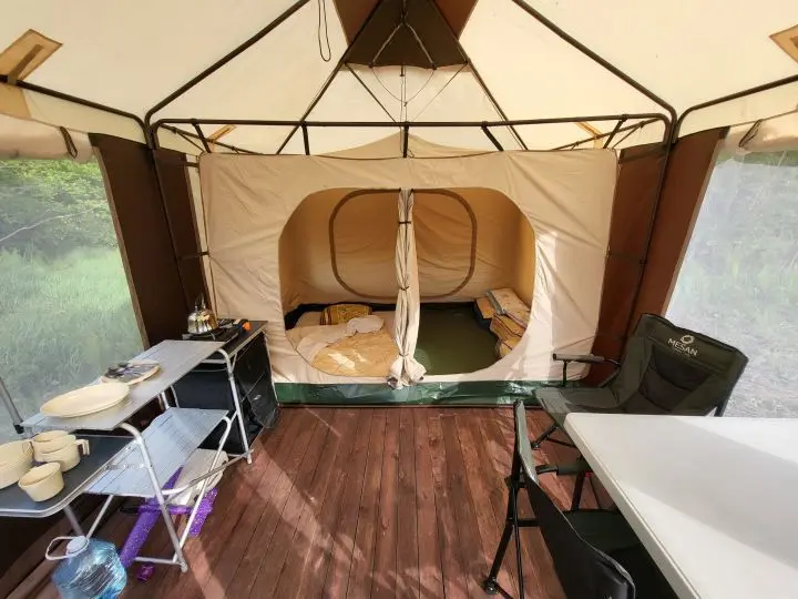 В спальной зоне — самонадувающиеся коврики, подушки и одеяла. В обеденной зоне — кухонный стол, туристические кресла, электричество 220 В и освещение, а также набор посуды.