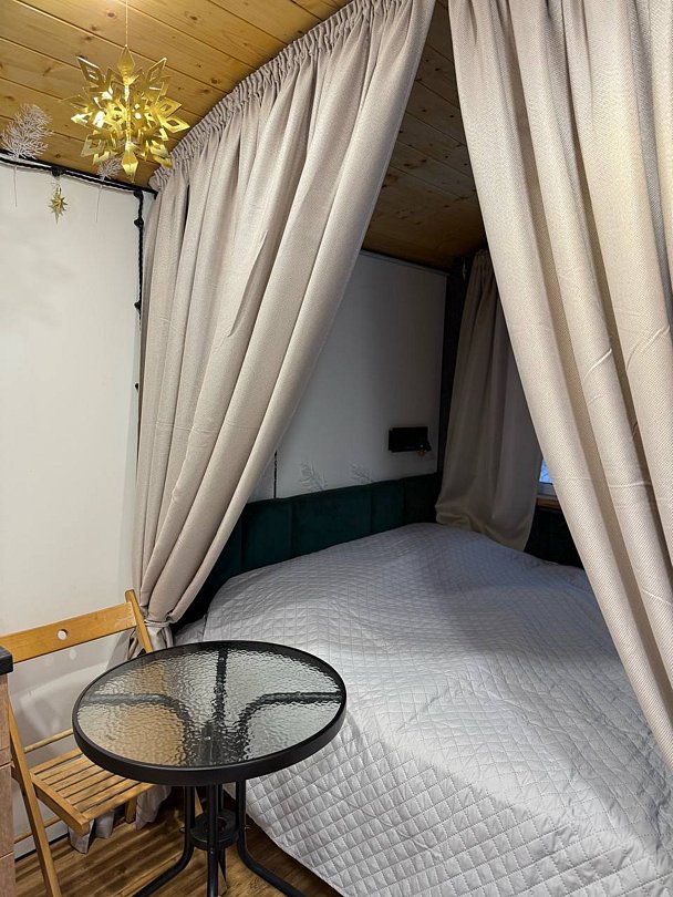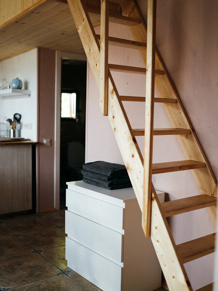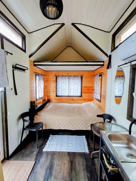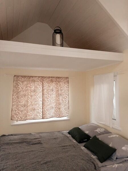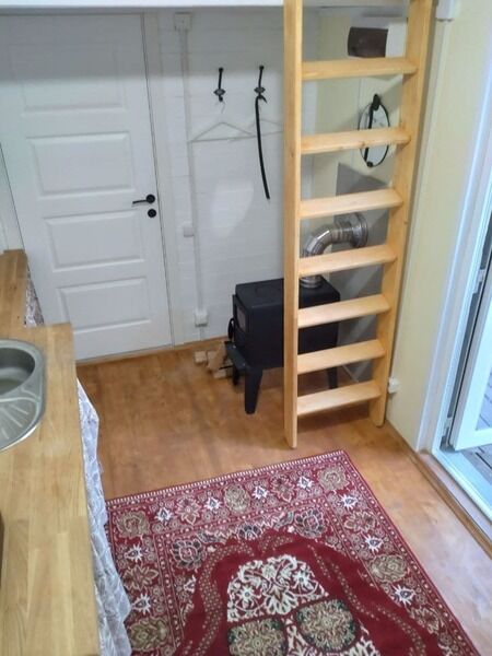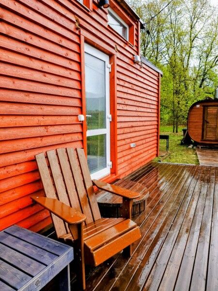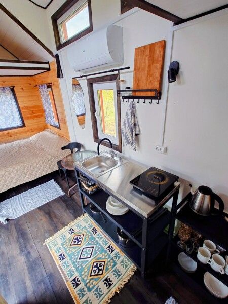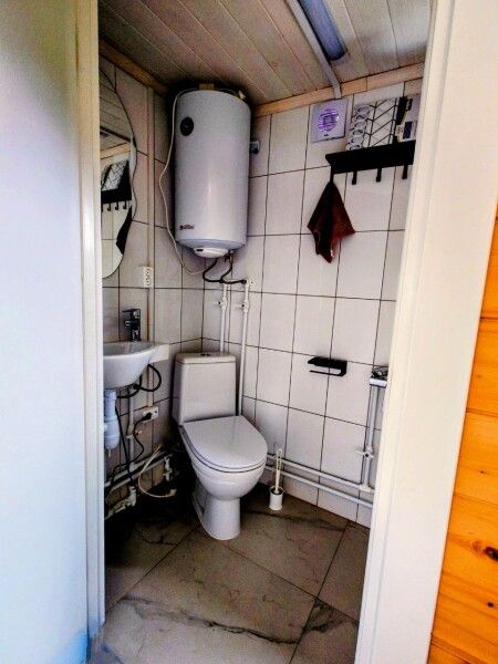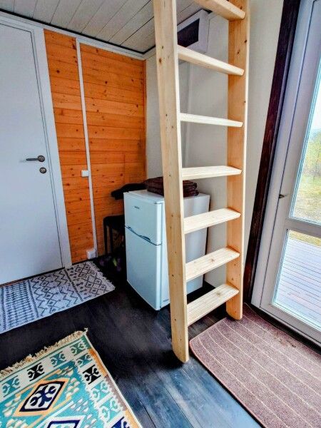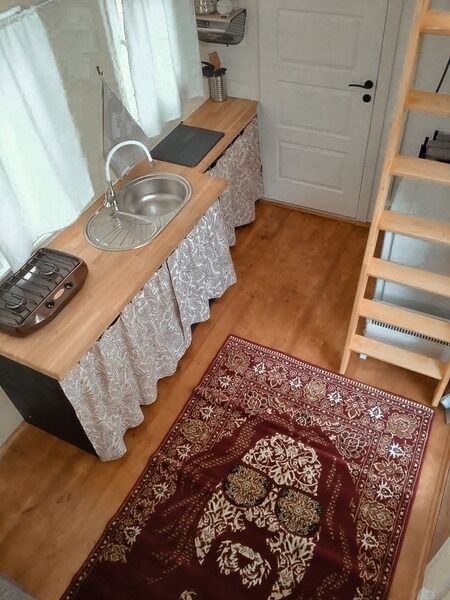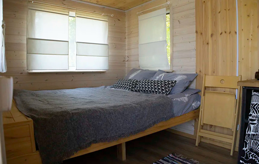 В доме есть небольшая кухня, холодильник, столовая посуда и посуда для готовки, 2 кровати шириной 160 см. (одна из них находится на втором свете), душ, туалет, стол, стулья.