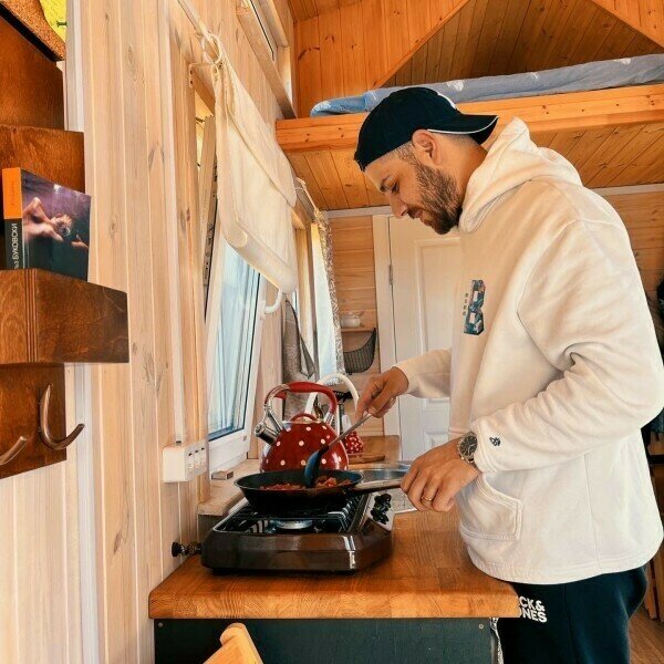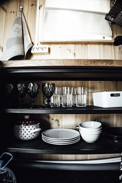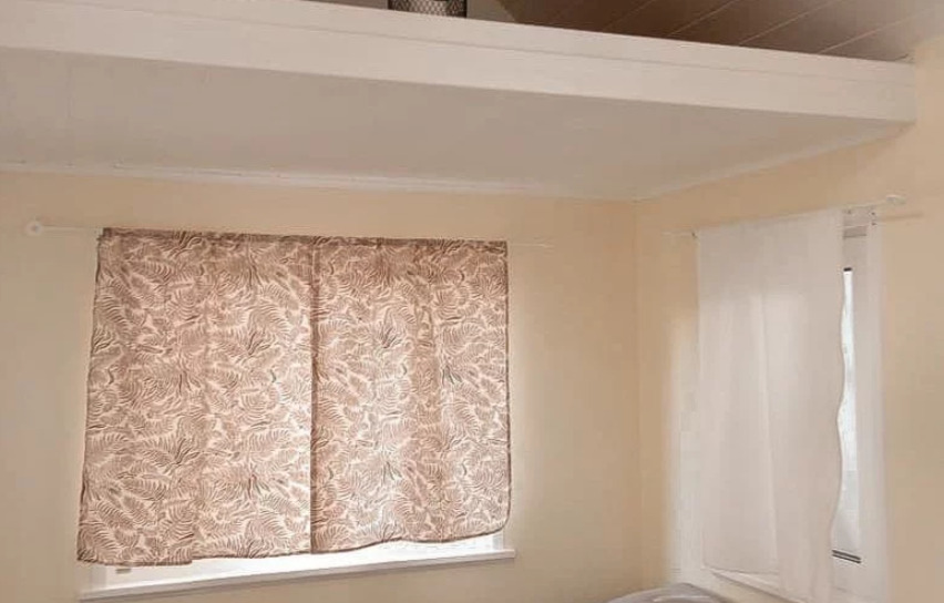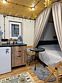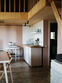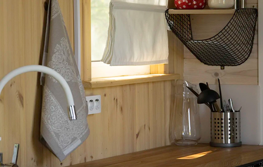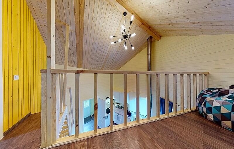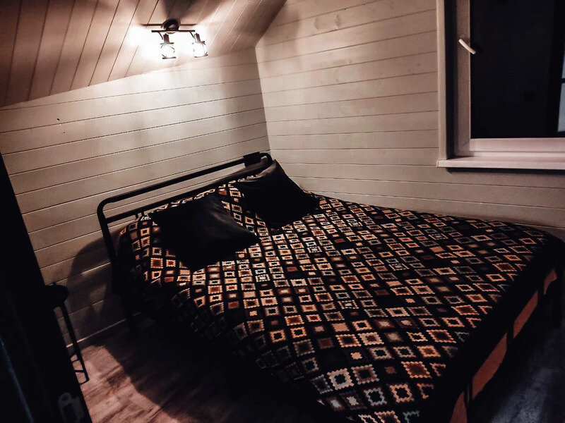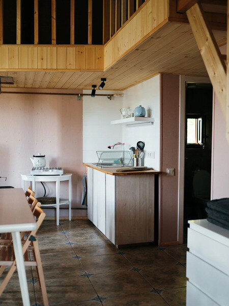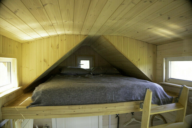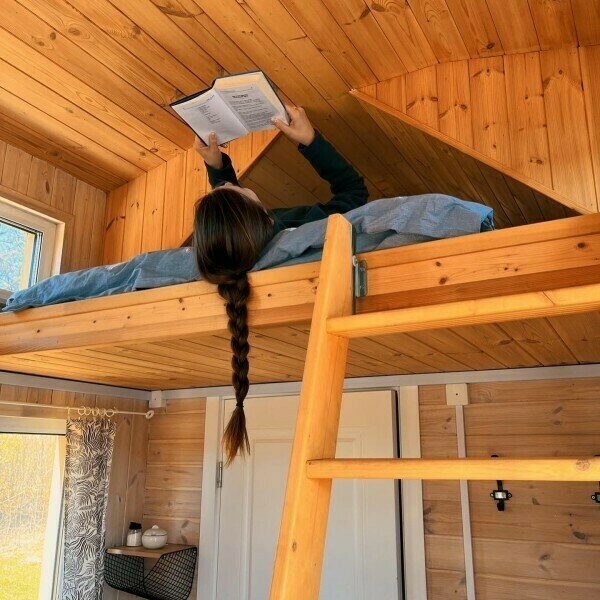 В доме есть небольшая кухня, холодильник, столовая посуда и посуда для готовки, 2 кровати шириной 160 см. (одна из них находится на втором свете), душ, туалет, стол, стулья.