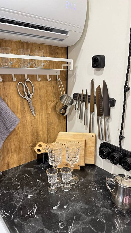 Полный набор всего необходимого: кастрюля, сковорода, разделочные доски, ножи, столовые приборы, фужеры и рюмки для вина, турка + кофе к ней, чайник, заварочный чайник, ножницы — утро начинается вкусно и без суеты