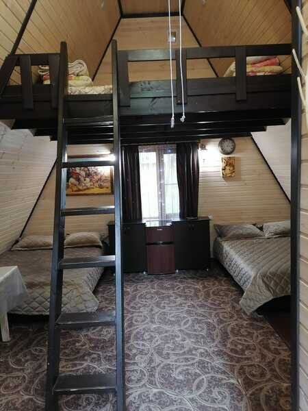 Для гостей подготовлены уютные номера, а также домики разной вместимости. Все они оснащены удобным спальным местом и необходимым набором мебели. Помимо этого, номера и девятиместный домик имеют индивидуальные ванные комнаты, а для проживающих в шестиместном доме оборудованы удобства на территории.