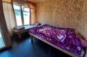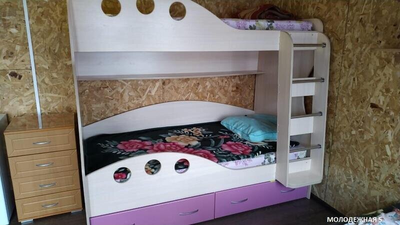Комплектация - двуспальная и односпальная кровати, матрасы, одеяла, подушки, стулья, стол, крючки для одежды, шторы, розетка.