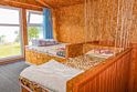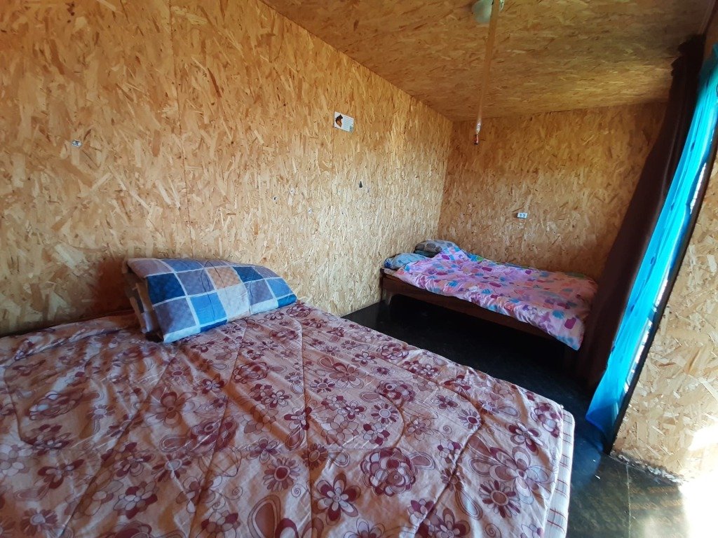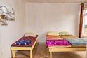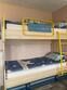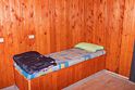 Комплектация - двуспальная и 2 односпальные кровати, матрасы, одеяла, подушки, стулья, стол, крючки для одежды, шторы, розетка.