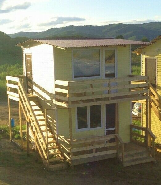 - Одноэтажные и двухэтажные домики на 2 комнаты с балконами.