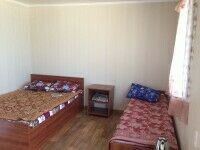 В домике имеется: две 3-х местные комнаты, общая веранда совмещенная с кухонной зоной, которая оборудована газовой плитой, холодильником, чайником. В каждой комнате одна двуспальная кровать и одна односпальная кровать.