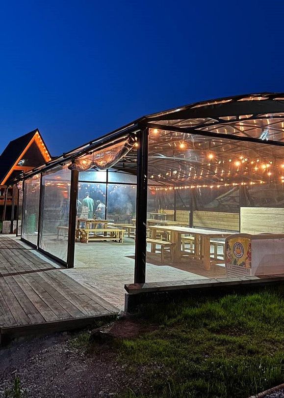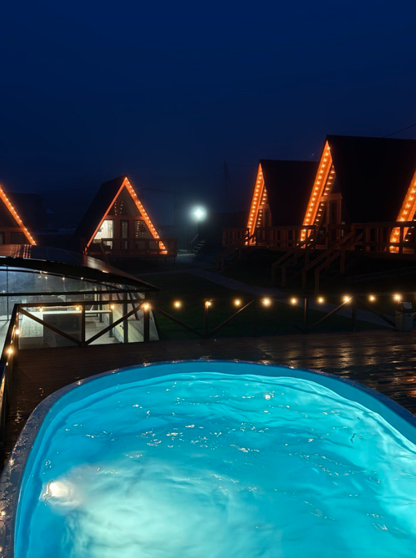 Здесь вас будет ждать теплый бассейн с шезлонгами, крытая мангальная зона, сезонный чан и общая кухня в отдельном домике, полностью оборудованная плитами и посудой, что позволит вам готовить любимые блюда. Есть парковка.