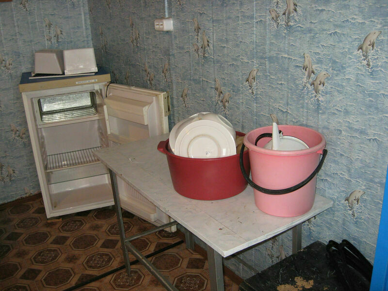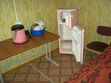 Постель, холодильник, чайник, посуда, стол и стулья