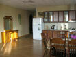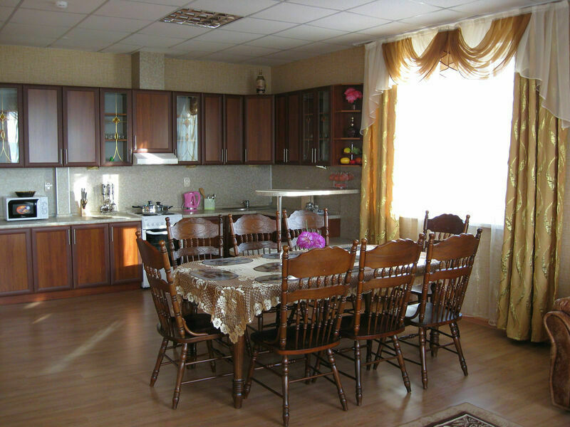 В гостиной: большой кухонный гарнитур, большой холодильник, набор посуды, электро. печь, Большой обеденный стол на 8 человек, 8 стульев, телевизор.