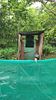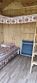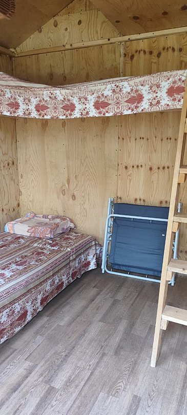Трёхместный домик с двумя окнами, двухъярусной кроватью, раскладной кроватью, кроватью для ребёнка до 9 лет. Постельное белье необходимо привезти свое. Душ и туалет Open-air pit latrine — походный вариант.