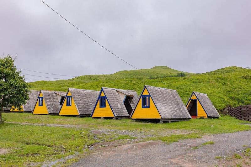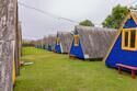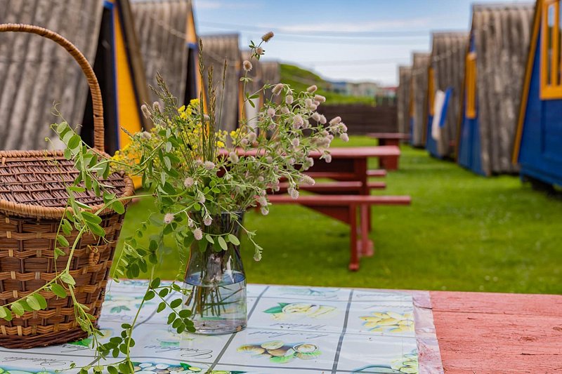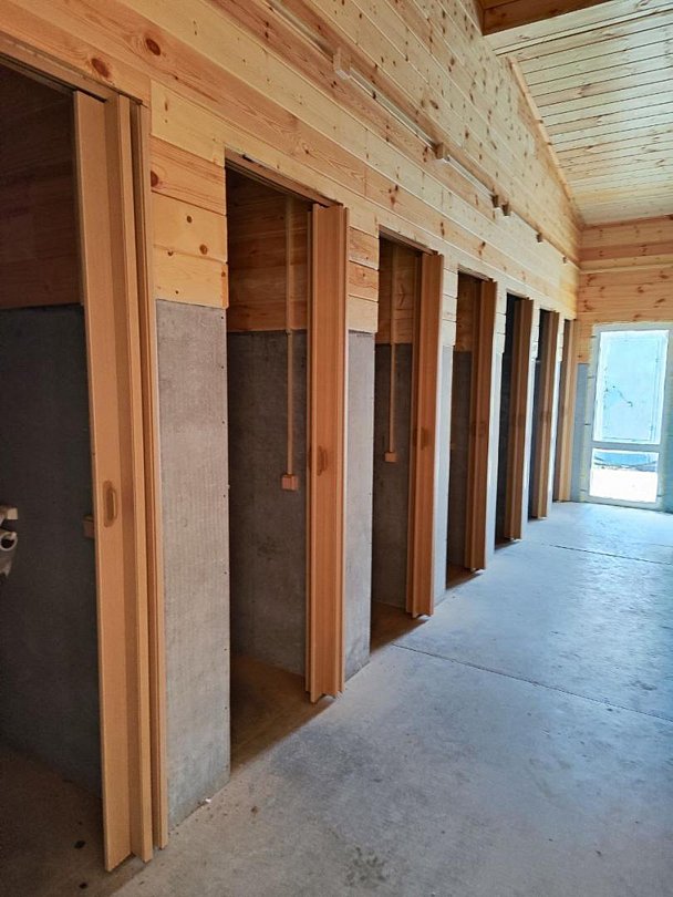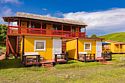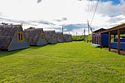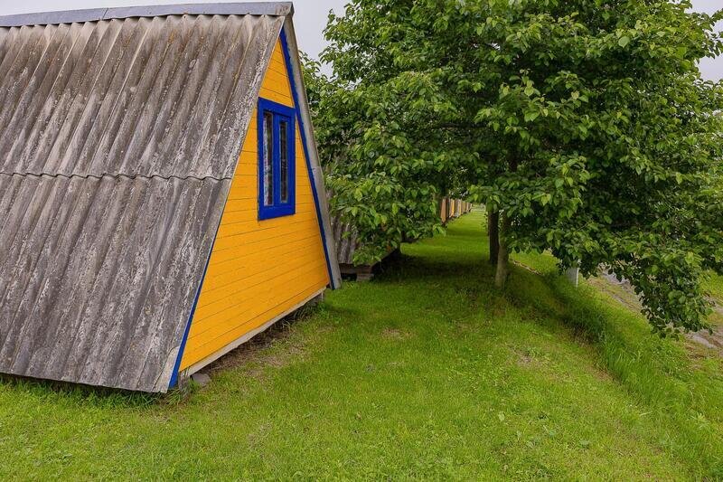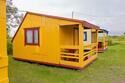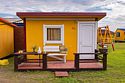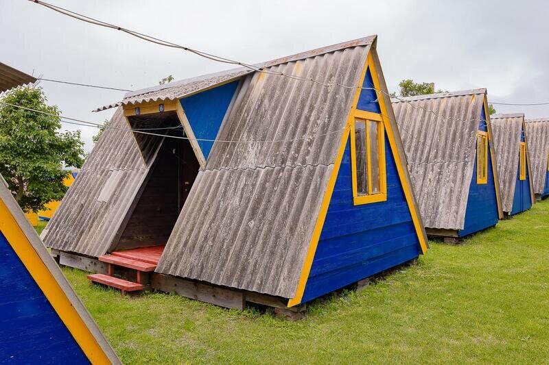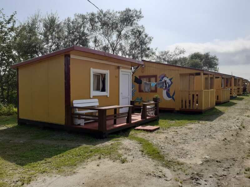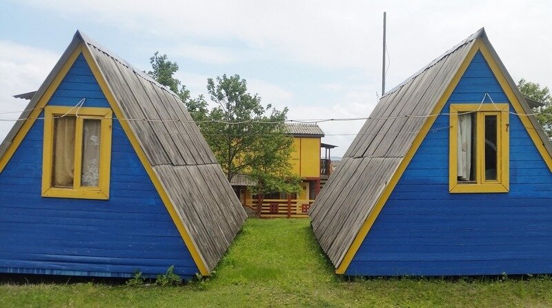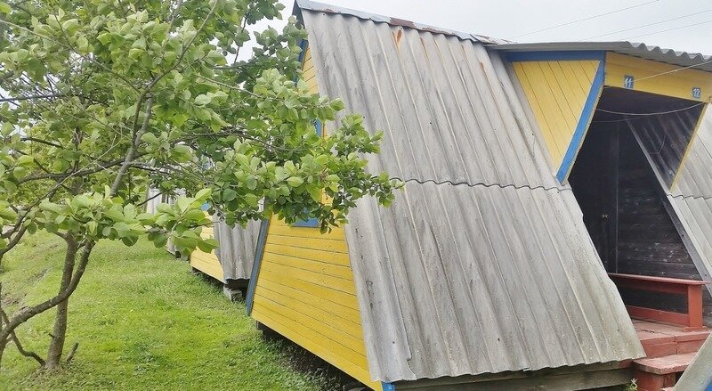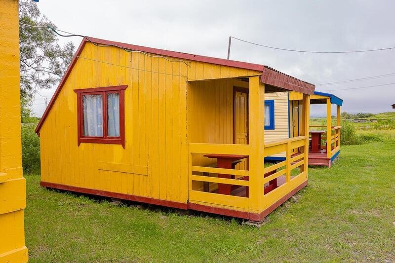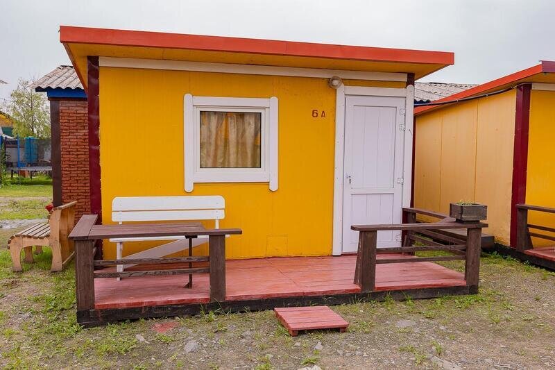 Выполнены из сэндвич панелей, расположены в середине базы вблизи коттеджей, волейбольной площадки и мангальной зоны. В домике: односпальная и двуспальная кровати, холодильник, зеркало, столик, вешалка для одежды, розетки. На большом крыльце перед домиком есть столик, скамейка, тумба