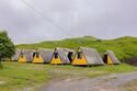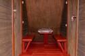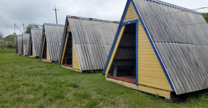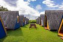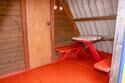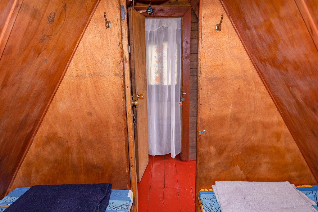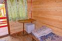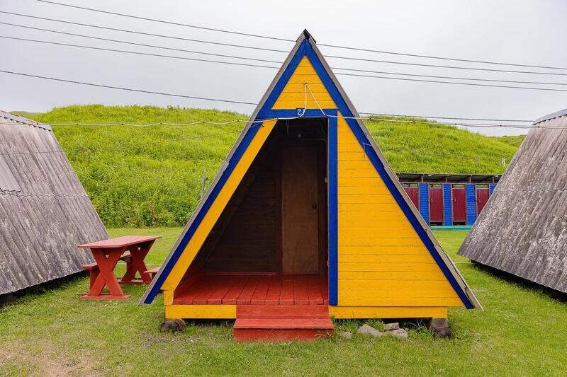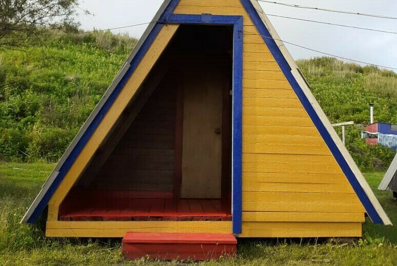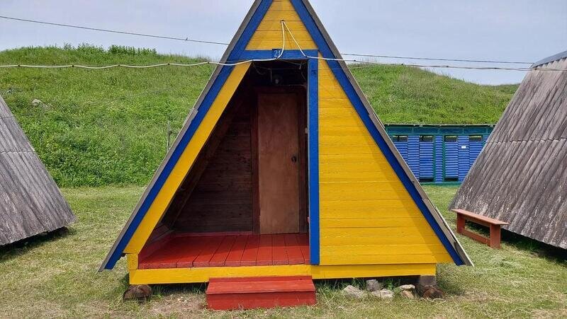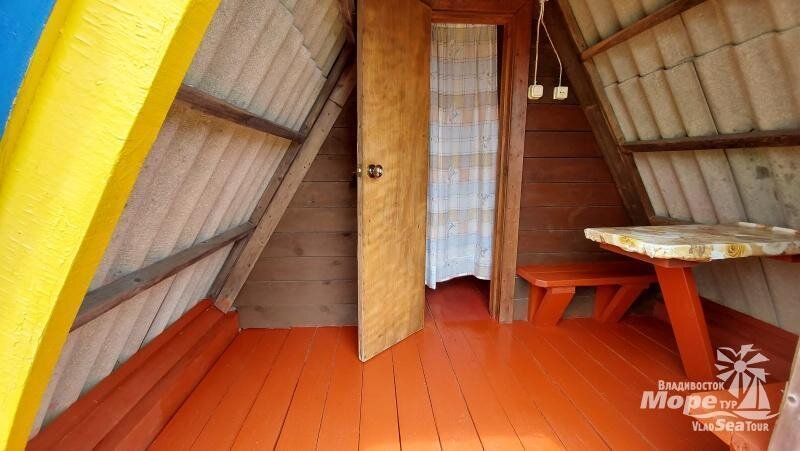 Небольшой деревянный домик по типу вигвама с верандой. Располагается напротив душевых и туалета. В домике две односпальные кровати. Отлично подойдет для одиночной поездки, проживания с другом или партнером. На веранде есть столик со скамейками и розетки.