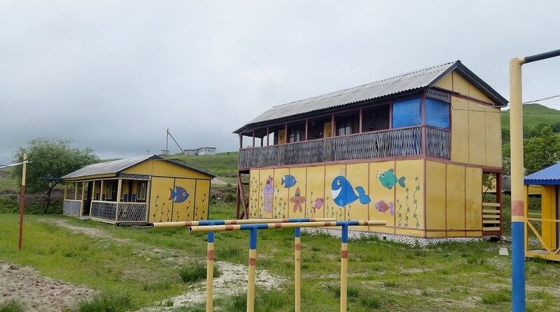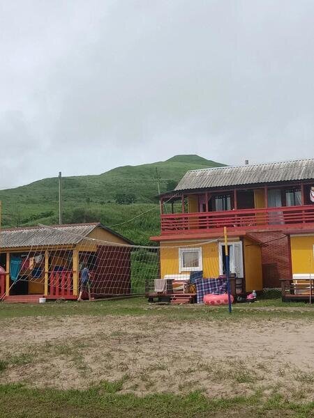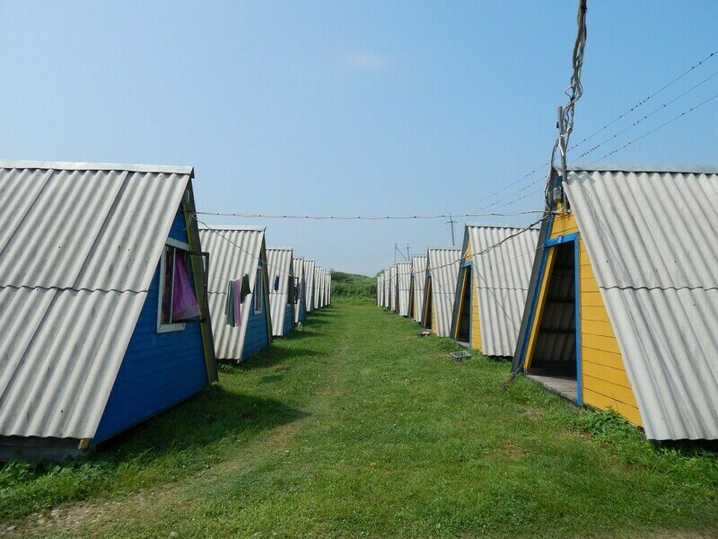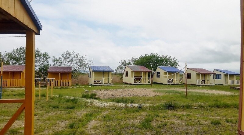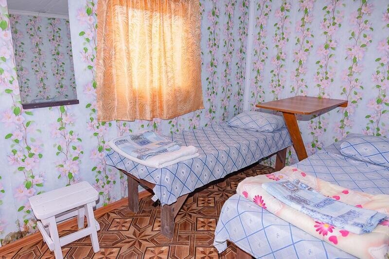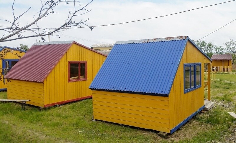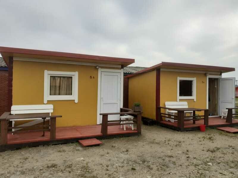 Коттеджи располагаются напротив волейбольной площадки, в центре турбазы. А из окон комнат на втором этаже открывается живописный вид на море. Комнаты укомплектованы холодильником, столом, лавочками или табуретками, розеткой, тремя местами для сна.