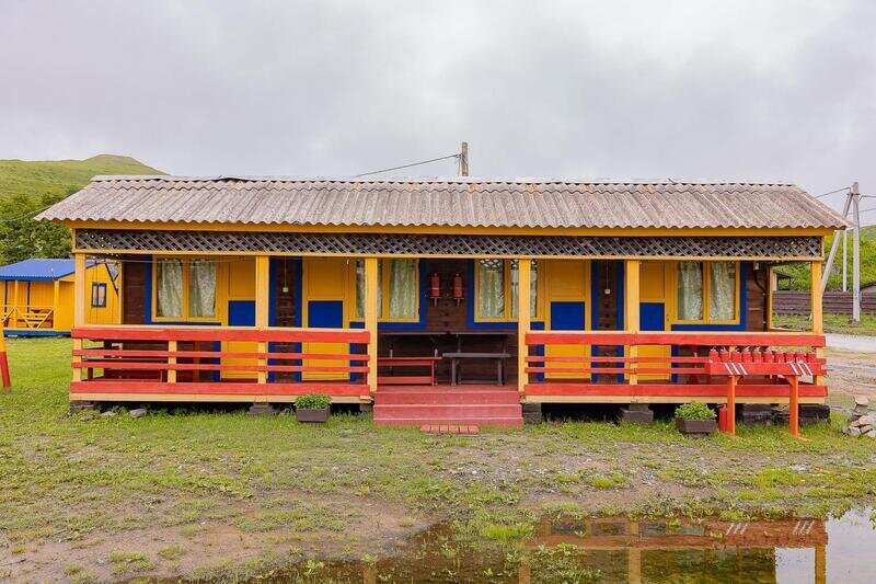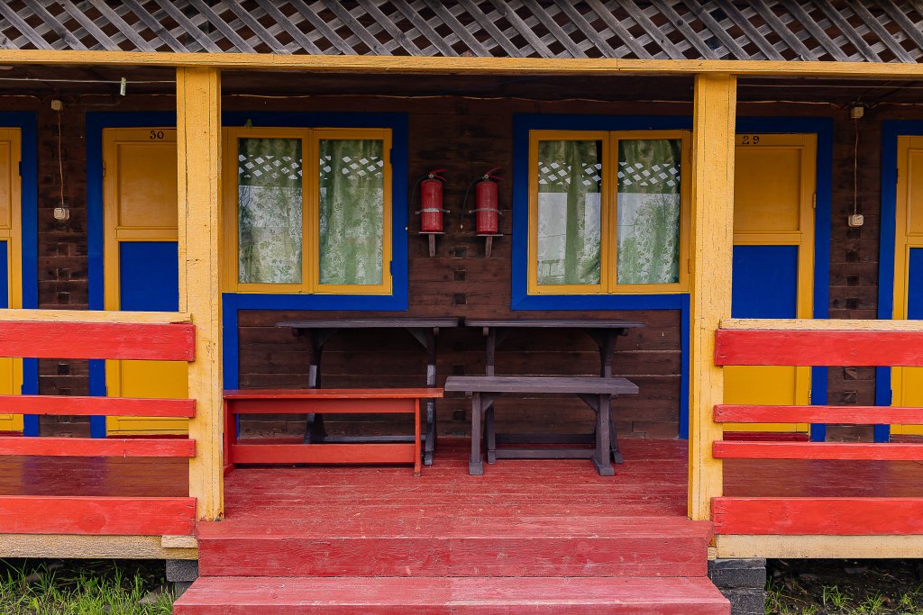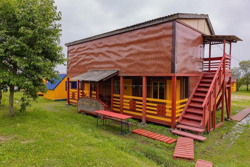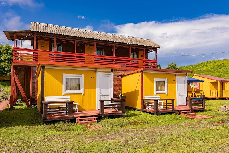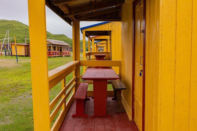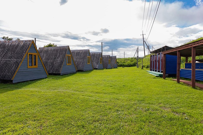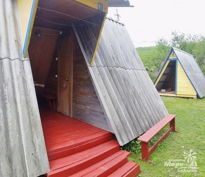 Выполнены из сэндвич панелей, расположены в середине базы вблизи коттеджей, волейбольной площадки и мангальной зоны. В домике: односпальная и двуспальная кровати, холодильник, зеркало, столик, вешалка для одежды, розетки. На большом крыльце перед домиком есть столик, скамейка, тумба.