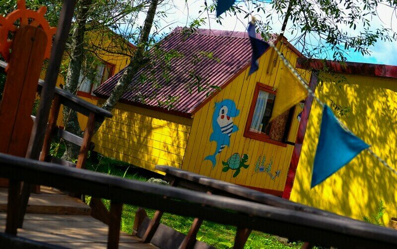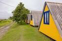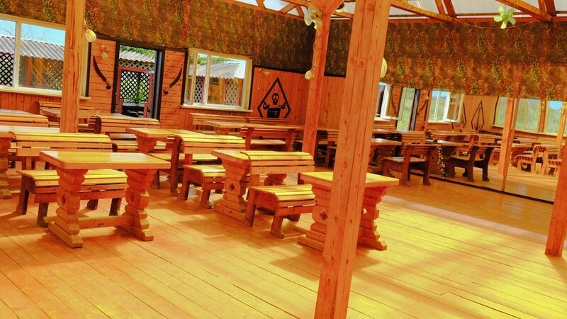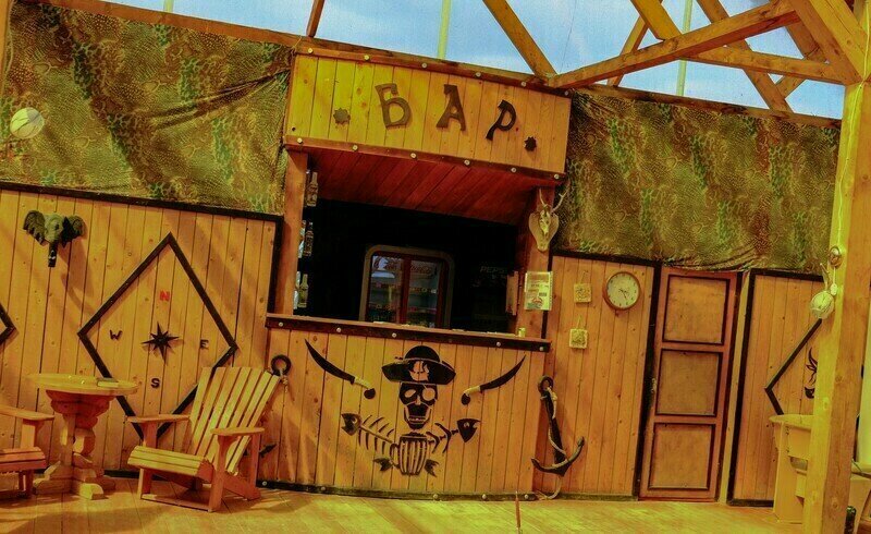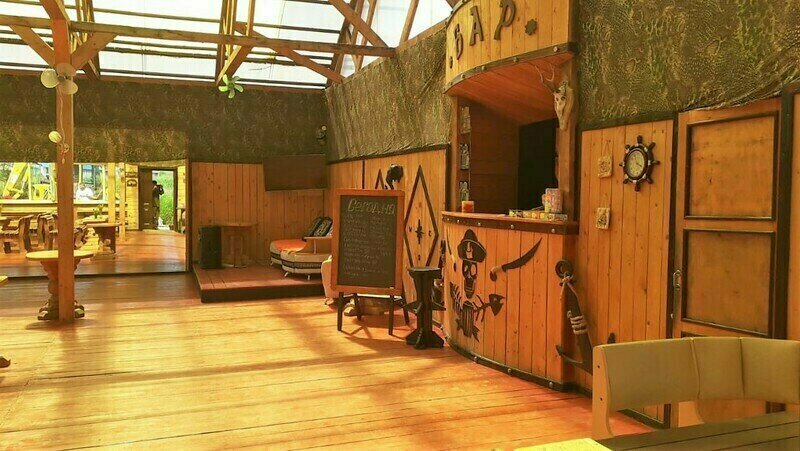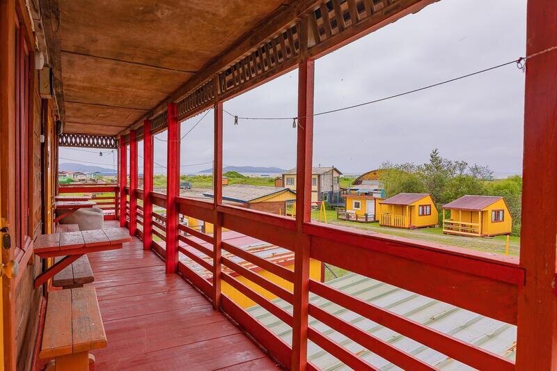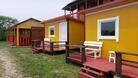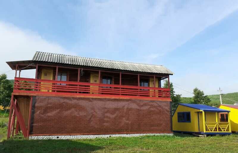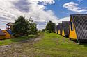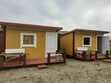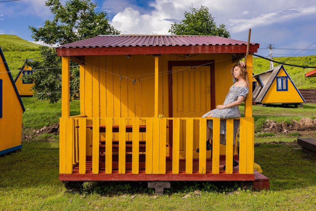 Выполнены из сэндвич панелей, расположены в середине базы вблизи коттеджей, волейбольной площадки и мангальной зоны. В домике: односпальная и двуспальная кровати, холодильник, зеркало, столик, вешалка для одежды, розетки. На большом крыльце перед домиком есть столик, скамейка, тумба.