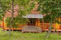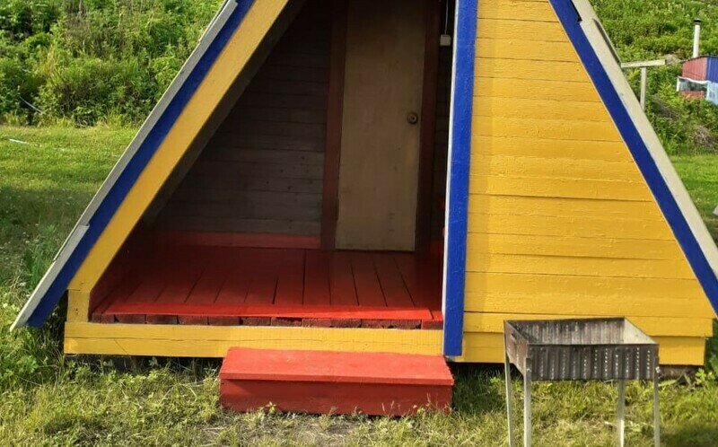 Небольшой деревянный домик по типу вигвама. Состоит из двух комнат и оснащен верандой. В одной комнате — двуспальная кровать, в другой — 2 односпальные. Поэтому в домике можно отлично разместиться с двумя детьми. На веранде есть столик со скамейками и розетки.