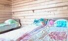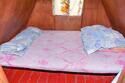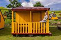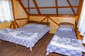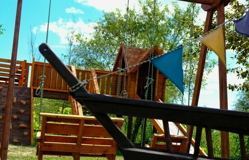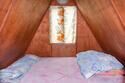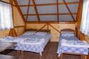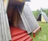 Небольшой деревянный домик по типу вигвама. Состоит из двух комнат и оснащен верандой. В одной комнате — двуспальная кровать, в другой — 2 односпальные. Поэтому в домике можно отлично разместиться с двумя детьми.