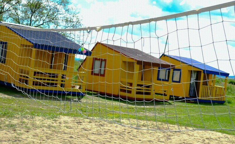 Коттеджи располагаются напротив волейбольной площадки, в центре турбазы. А из окон комнат на втором этаже открывается живописный вид на море.
