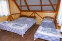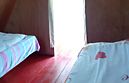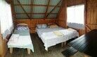 три односпальные кровати, холодильник, стол. Общая веранда: столики и скамейки для каждого номера.