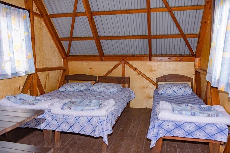 Уютный трехместный домик с верандой. Отлично подойдет для семьи с детьми. Оборудован тремя односпальными кроватями. Часть домиков располагается на живописной лужайке между баней и двухэтажным коттеджем, а другая — напротив волейбольной площадки и зоны барбекю на въезде в базу.