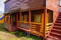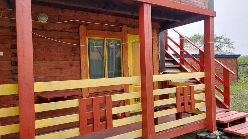 Коттедж сделан из бруса, с четырьмя комнатами на 2-3 человека и общей верандой. Стоимость указана за комнату в коттедже. Можно приехать большой компанией и снять весь дом. Коттеджи располагаются напротив детской и волейбольной площадок, в центре турбазы. Для каждой комнаты предусмотрен свой столик и стулья на веранде.