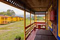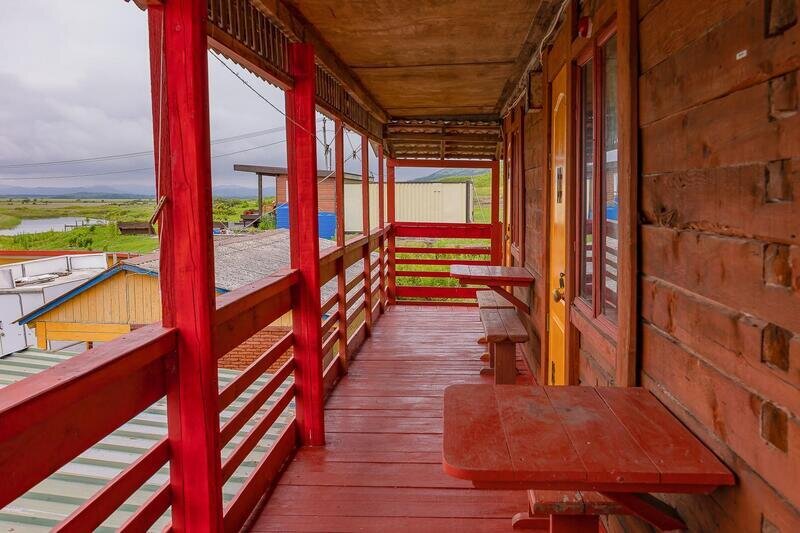 три односпальные кровати, холодильник, стол. Общая веранда: столики и скамейка для каждого номера.