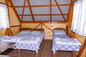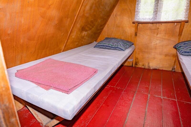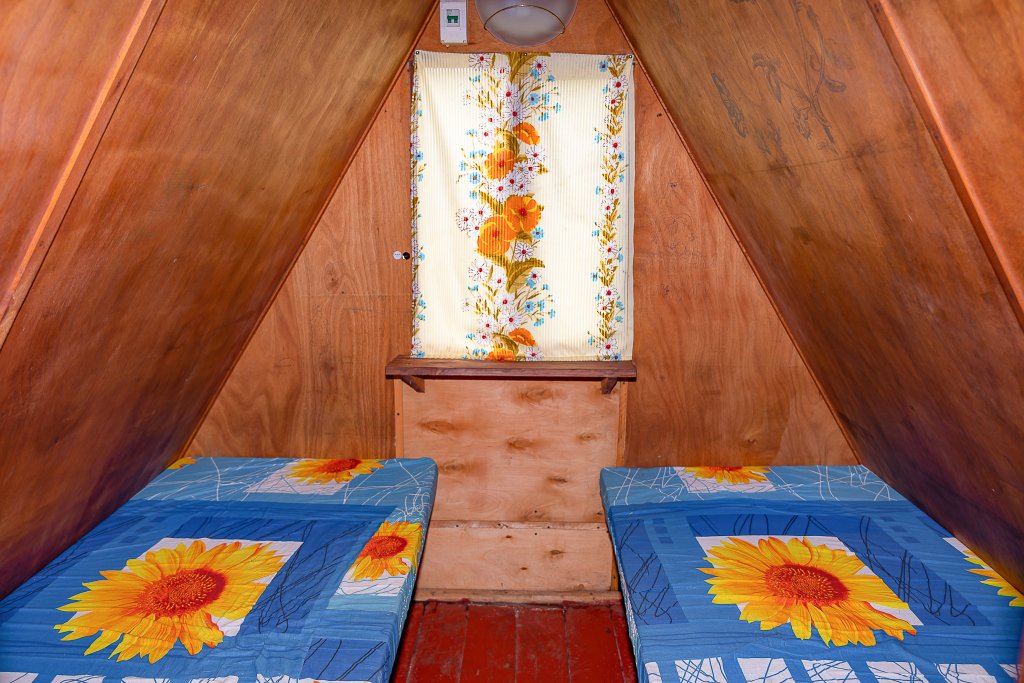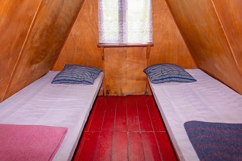 Небольшой деревянный домик по типу вигвама с верандой. Располагается напротив душевых и туалета. В домике две односпальные кровати. Отлично подойдет для одиночной поездки, проживания с другом или партнером.