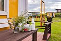Коттеджи располагаются напротив детской и волейбольной площадок, в центре турбазы.Для каждой комнаты предусмотрен свой столик и стулья на веранде.