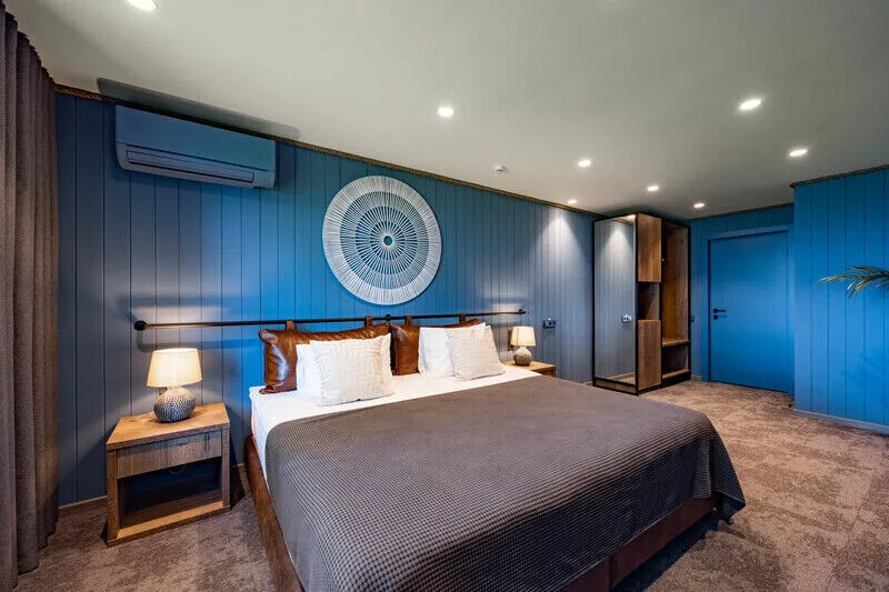 В номере: мини-холодильник, сплит-система, фен, чайник, сейф, вид на залив, вид на канал.