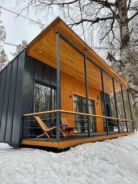 Уютный и комфортабельный домик с панорамными окнами и просторной террасой с видом на озеро. В доме 3 раздельные спальни; большая гостиная, совмещенная с кухней, оснащенной всем необходимым и санузел, совмещенный с электрической сауной.